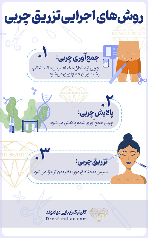 در ابتدا، چربی از مناطق مختلفی از بدن مانند شکم، پشت و ران جمعآوری میشود. این چربی به صورت خونگیری یا با استفاده از تکنیکهای لیپوساکشن استخراج میشود.نطقه توزیع میشود.